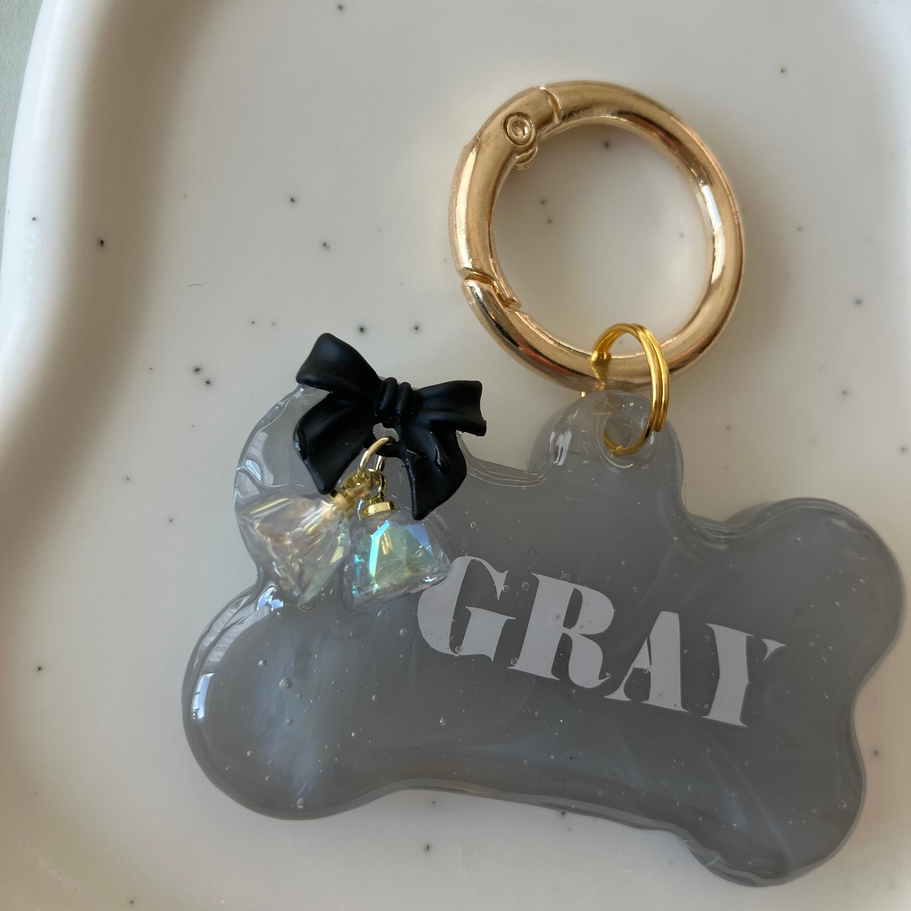 大人かわいいグレーに、上品な黒リボンを組み合わせたおしゃれで可愛いデザイン。